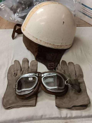 Antique Helmet, Goggles, and Gloves - would look just right in a 100 with the windscreen down. |